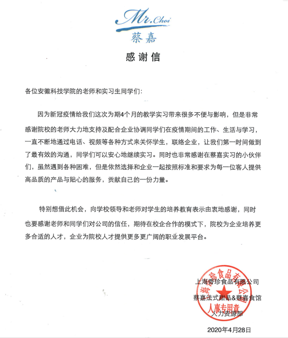 截至2020年4月30日,乐投官方网站_乐投(中国)股份有限公司,食品工程学院2017级烹饪与营养教育专业39名学生为期四个半月的校外专业实习正式结束。对于校外实习的这39名学生来说,是一次漫长而不同以往的实习经历。这次实习不仅让学生们学到了专业素养和技能,获得了实习单位的表扬和认可,更让他们从一封封来自援鄂医务人员的感谢信中学会了危难中的守望相助和感恩。