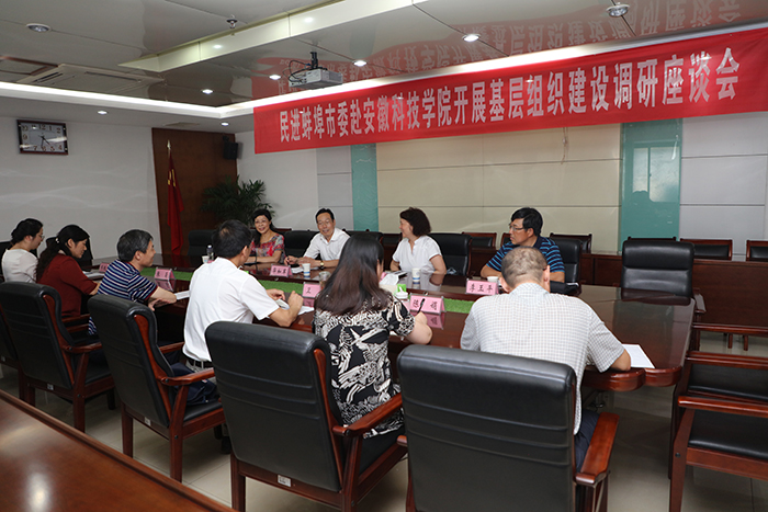 7月6日下午,蚌埠市委统战部常务副部长华如军、民进蚌埠市委主委秦志华、专职副主委魏曼玲、组织部长李玉平等一行四人来我校开展统战工作及民主党派基层组织建设调研活动。校党委书记蒋德勤热情接待了华如军一行,并在图书馆九楼会议室主持召开了座谈会。校党委委员、宣传(统战)部部长卫胜出席会议,校民进支部主委张菊、统战部有关人员、民进支部部分会员参加了座谈会。