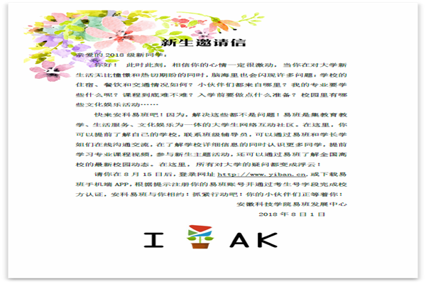 2019年,安科易班首次将校园文化产品设计融入新生邀请信设计中,纸质邀请信变成了融入校园插画设计的学校文化卡套,创新方式制作了H5网页版“安科易班邀请信”,向新生说明易班进驻方式。同时,在安科易班平台推出2019易班迎新系列说明推文,开展选拔新生代言人、军训日记活动预热等各类易班线上活动,配合全校新生入学教育和易班平台入驻。这一年,小小的卡套成了师生手中的网红产品。