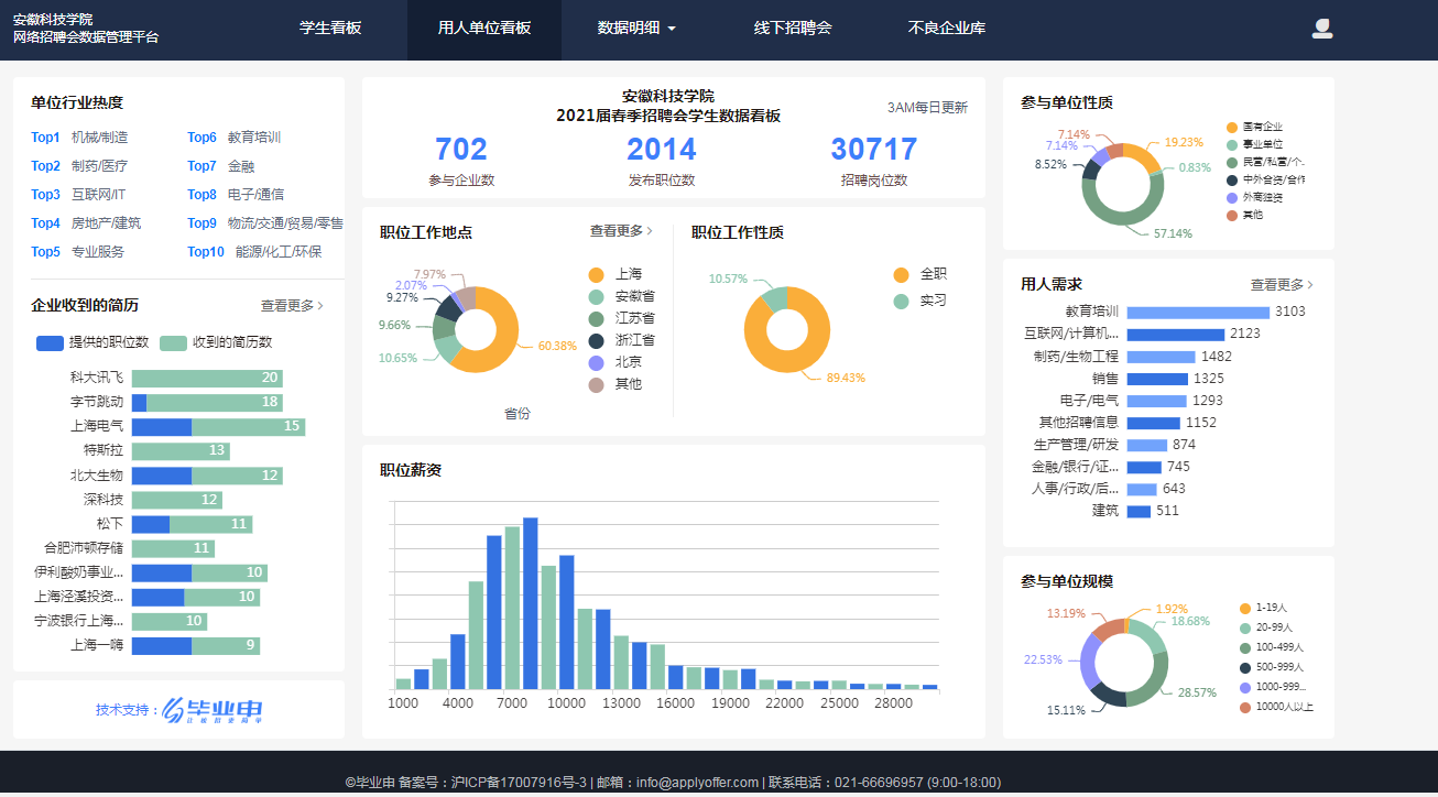 根据2018-2020三个年度毕业生就业质量报告,我校毕业生省外就业主要面向长三角核心地区,其中,在沪就业比例一直在10%以上。毕业生去向就是就业工作取向,学校加强长三角区域就业布局,作为毕业生就业工作的重点布局领域。2020年下半年疫情缓解以来,学校积极与上海学生事务中心联络,继续拓展合作领域,截至2021届毕业生离校时,先后举办“多方联动、聚力就业”上海市2021届高校毕业生春季“安科之生”专场招聘会、“安科之生”春季就业冲刺月(互联网专场)、高校毕业生就业促进周2021年“安科之生”专场、毕业季“安科之生”专场、长三角招聘会乐投官方网站_乐投(中国)股份有限公司,“海聚英才”2021年离校未就业毕业生专场云聘会、长三角“安科之生”2021届毕业生离校未就业专场,6个场次共有36345次访问记录,投递简历2033份,702家用人单位共发布5007个职位,73865个岗位,涉及机械制造、制药医疗、互联网等诸多行业领域,涵盖了数字经济、电子信息、新材料等重点发展产业,为毕业生融入长三角区域就业提供了广阔的双选平台。(特约通讯员:司萍 审核:施培智 编辑:张威)