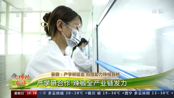 萧县有着中国“辣椒制种第一县”的美誉,辣椒制种是萧县独特的传统产业,其鲜椒制种规模占全国的40%以上。但随着科技的进步,萧县辣椒制种的传统技术优势跟不上时代的步伐,当地政府和广大椒农以及辣椒企业科技兴农、乡村振兴的愿望受到了严重的制约。在县委、县政府的大力支持下,以安徽华强种业有限公司为代表的众多企业和椒农开始和我校辣椒课题组寻求合作。当天的报道中,我校隋益虎教授、胡能兵博士和众多研究生向全国观众展示了辣椒研究的专业仪器设备和操作规程,记者的现场报道也详细介绍了我校辣椒研究所取得的丰硕成果,盛赞辣椒课题组为当地辣椒制种、科技兴农所做的贡献。