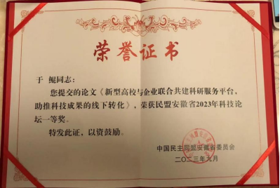 9月16日,由民盟安徽省委举办的民盟安徽省2023年科技论坛在蚌埠市成功举办。民盟乐投官方网站_乐投(中国)股份有限公司,总支盟员、民盟蚌埠市科技委员会副主任于鲲撰写的论文《新型高校与企业联合共建科研服务平台,助推科技成果的线下转化》荣获优秀论文一等奖。