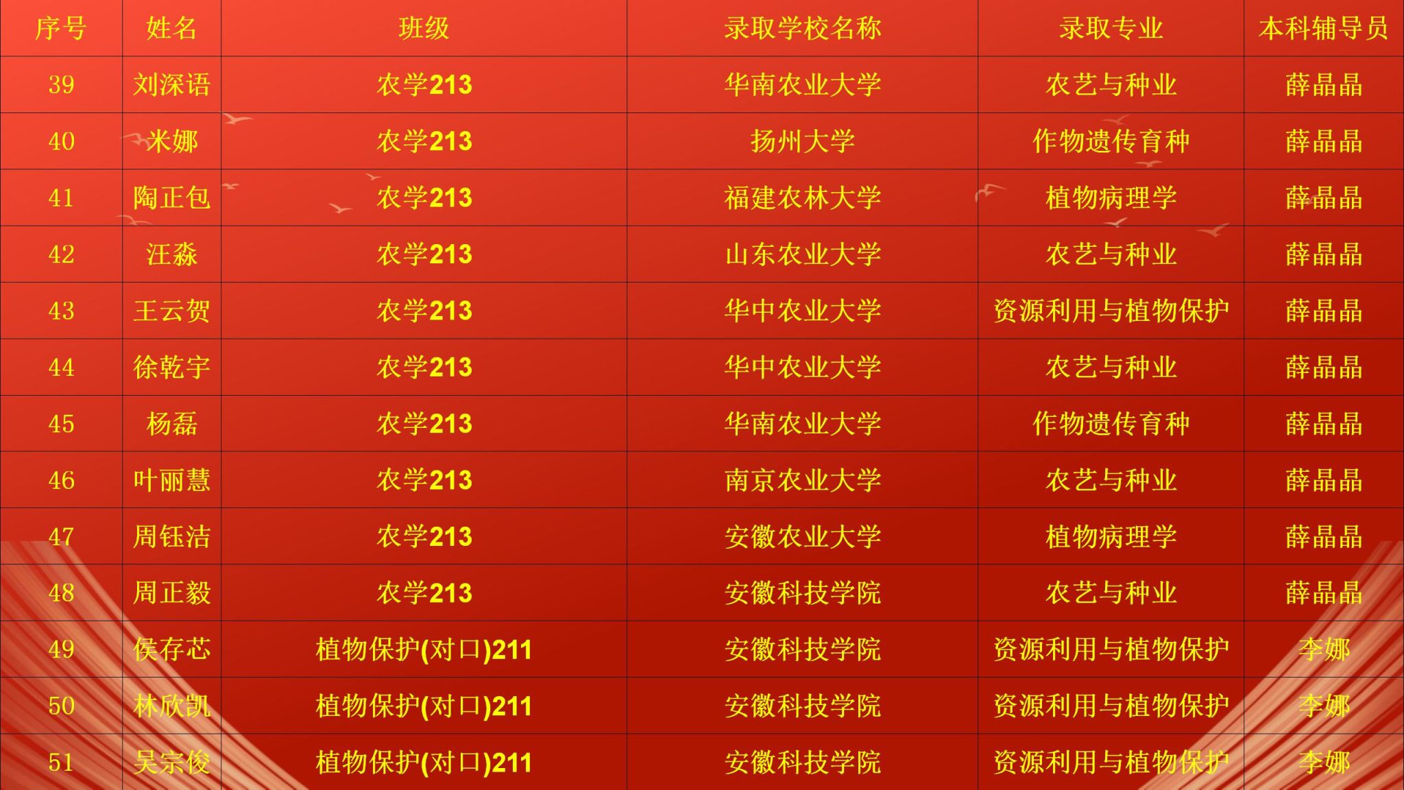 2025年全国硕士研究生录取工作落下帷幕,农学院2025届毕业生考研取得佳绩,345名毕业生,172人考取国内外硕士研究生,升学率达49.86%,实现“两生一硕士”。其中,66人被中国农业大学、西北农林科技大学、华东理工大学、重庆大学、南京农业大学、华中农业大学、华南农业大学、西南大学等双一流建设高校录取。
