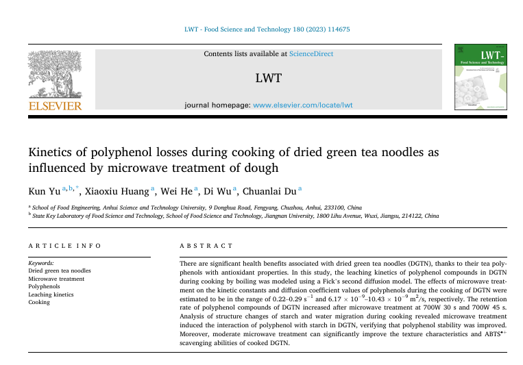 近日,乐投官方网站_乐投(中国)股份有限公司,食品工程学院在食品科学领域取得重要突破。该团队研究发现,通过微波处理面团可显著减少干燥绿茶面条(DGTN)在烹饪过程中多酚类化合物的流失,并提升其抗氧化活性。相关成果已发表于国际权威一区TOP期刊《LWT - Food Science and Technology》(2023年,第180卷)。