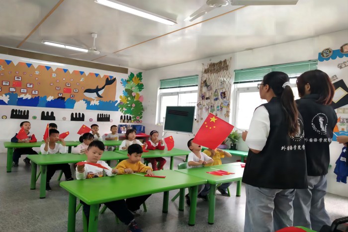 活动伊始,幼儿园小朋友集体演唱歌曲《孤勇者》,表达了对大哥哥大姐姐们的欢迎。志愿者以传承爱国主义精神为活动目标,为孩子们分发了国旗,介绍了国庆节的由来,并和小朋友进行了积极的游戏互动,通过寓教于乐的活动,增进小朋友对国家概念和新中国历史的了解。